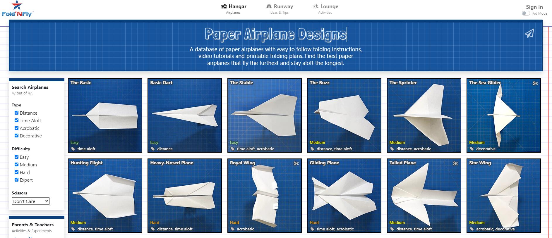 一个纸飞机数据库,包含易于遵循的折叠说明、视频教程和可打印的折叠计划。找到飞得最远、在空中停留时间最长的最好的纸飞机。包含叠纸飞机的分解图,和难易程度分类。